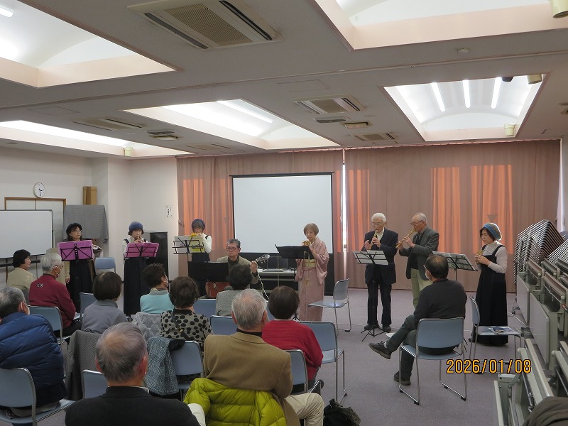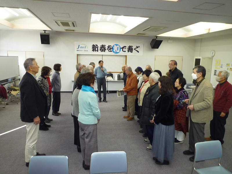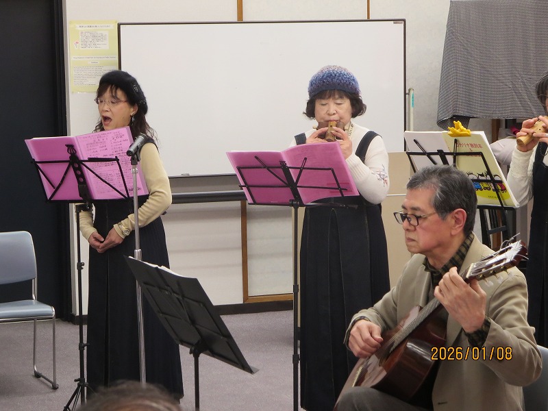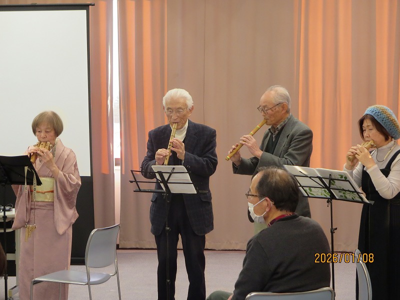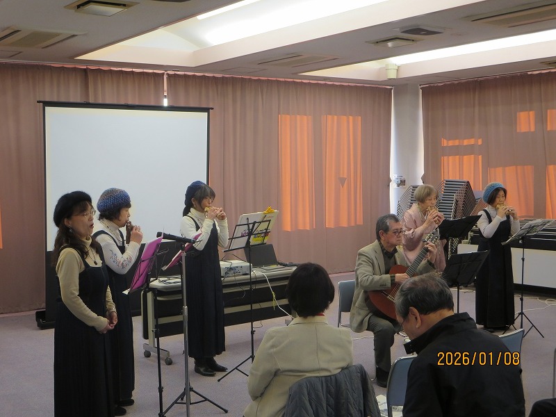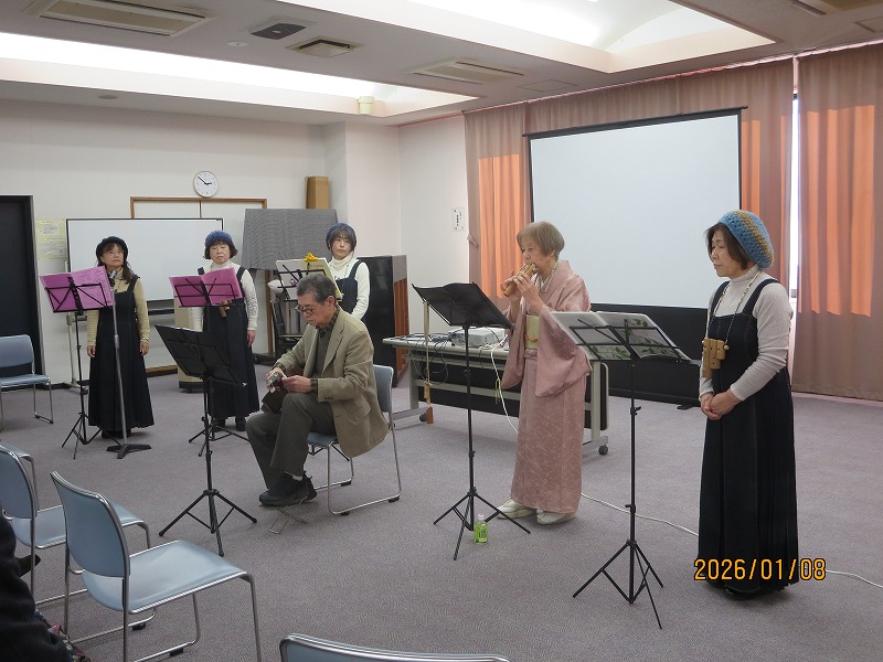 1月8日楽習会「賀詞を交換し新春を和で寿ぐ」を女性センター多目的ホールで開催、ゲストに日立市吉田正音楽記念館職員の楽団とコカリナ演奏グループをお迎えした。前回と異なり、ピアノ設置場所に合わせ海側を正面に会場の向きを設定した。