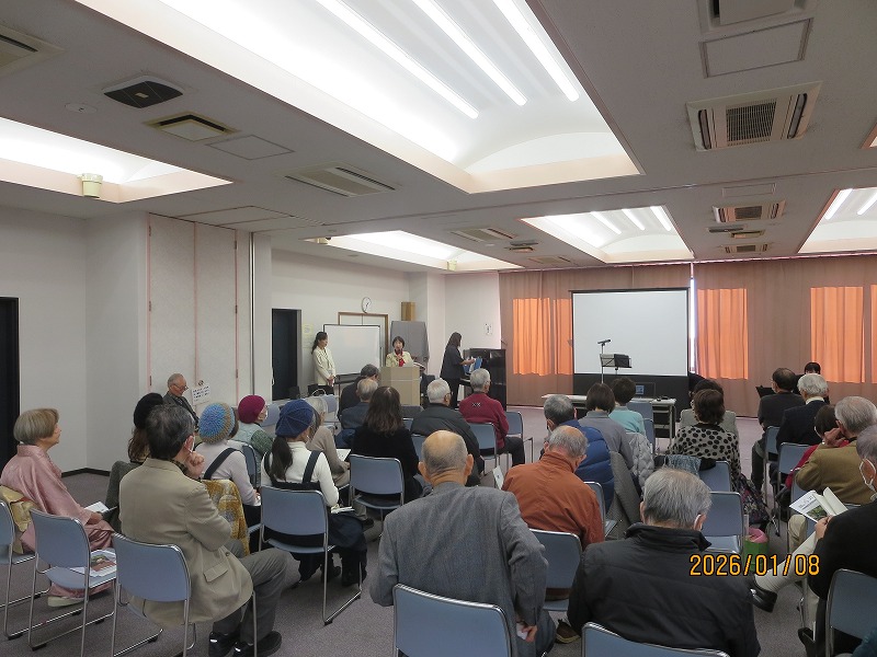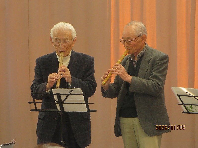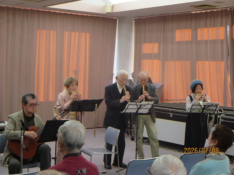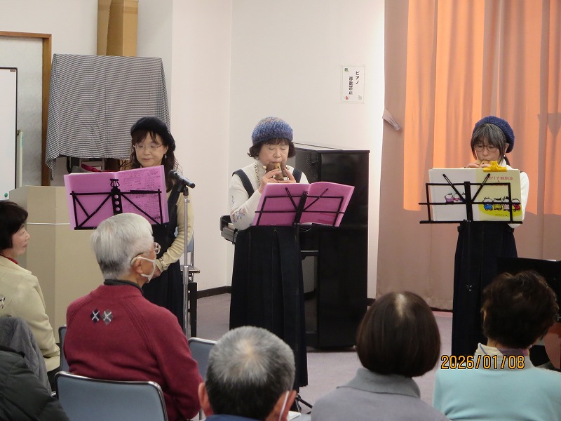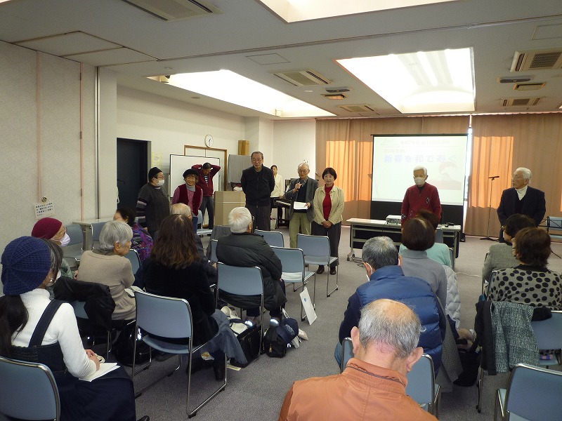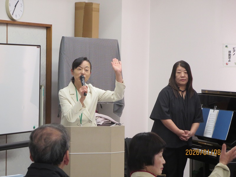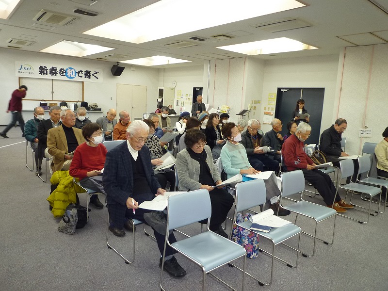 1月8日楽習会「賀詞を交換し新春を和で寿ぐ」を女性センター多目的ホールで開催、ゲストに日立市吉田正音楽記念館職員の楽団とコカリナ演奏グループをお迎えした。前回と異なり、ピアノ設置場所に合わせ海側を正面に会場の向きを設定した。