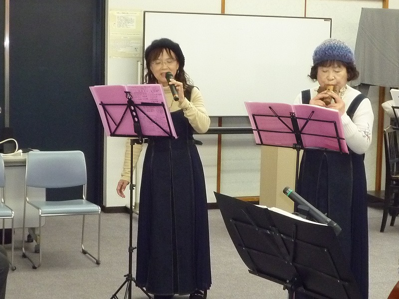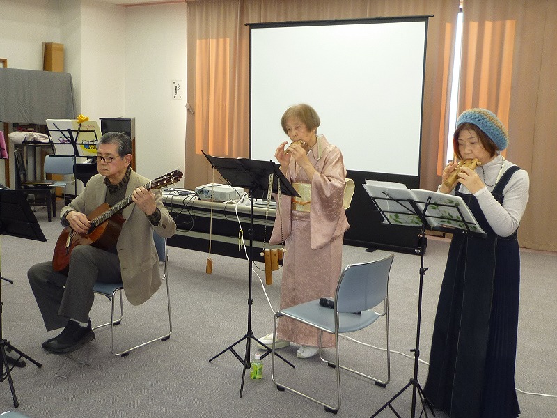 休憩後、第2部はコカリナ6人グループ「ひなたぼっこ」の演奏へと進んだ。初めに雅楽の曲で越天楽などを演奏され、次に誰もが知っている曲で、野に咲く花のように、涙そうそうなどが披露された。演奏の合間に楽器コカリナの種類・音色の解説もあり、ギターと歌を交えた12曲を披露いただいた。アンコールに応え、ギターの独奏で「いい日旅立ち」を演奏いただいた。後半はコカリナと元ケーナフレンズのJ-netメンバーとのコラボ演奏が有り、久しぶりのケーナに会場も賑わいだ。