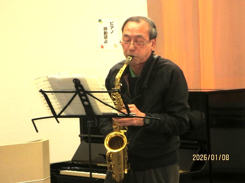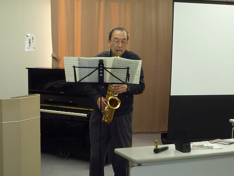 最後はJ-net会員の石川さんのアルトサックスでオリーブの首飾りとハロード―リの2曲が披露され、会場一杯に大らかな音色が奏でられた。